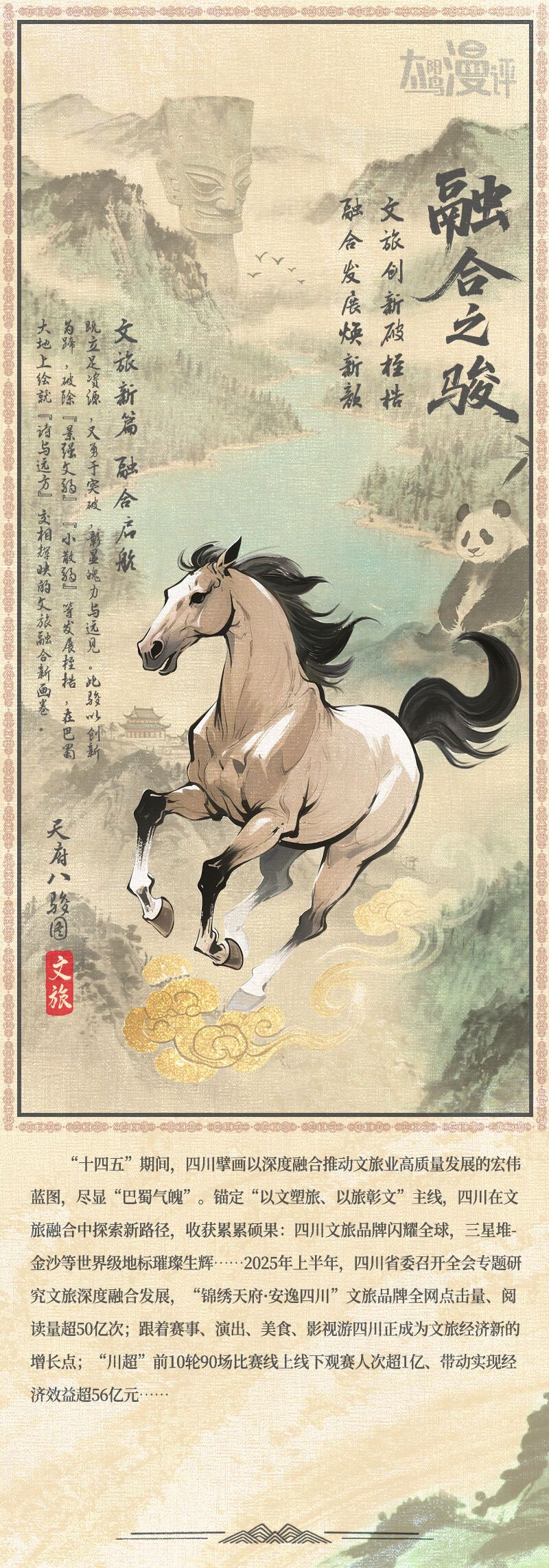 既立足资源,又勇于突破,彰显魄力与远见。此骏以创新为蹄,破除“景强文弱”“小散弱”等发展桎梏,在巴蜀大地上绘就“诗与远方”交相辉映的文旅融合新画卷。