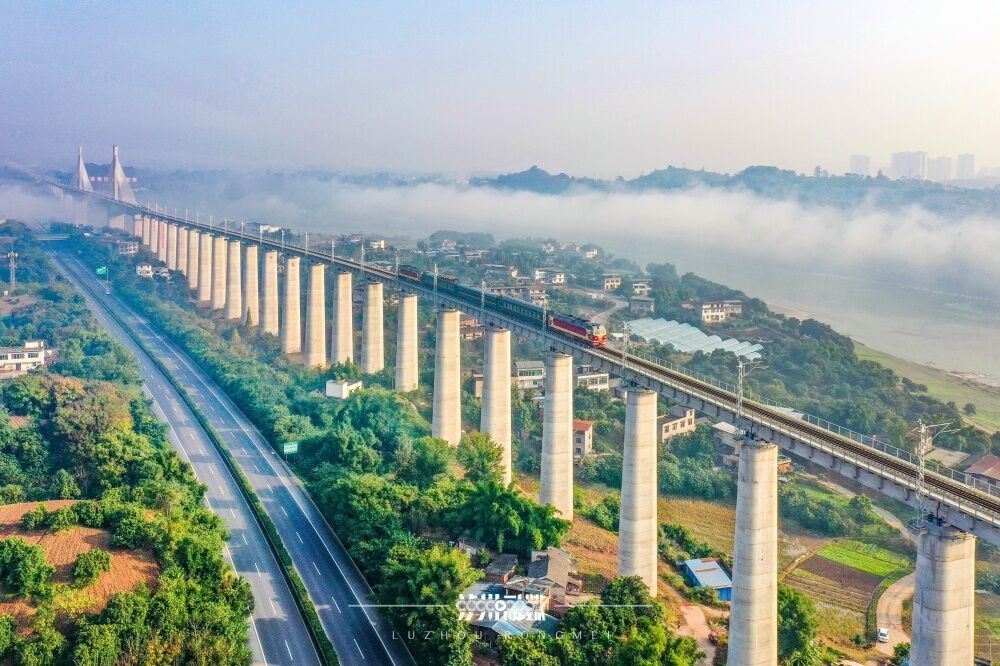 2024年3月25日,西部陆海新通道隆泸叙铁路、渝昆高铁、G76厦蓉高速公路与远处的绵泸高铁内自泸线,在泸州市沱江畔“同框”。