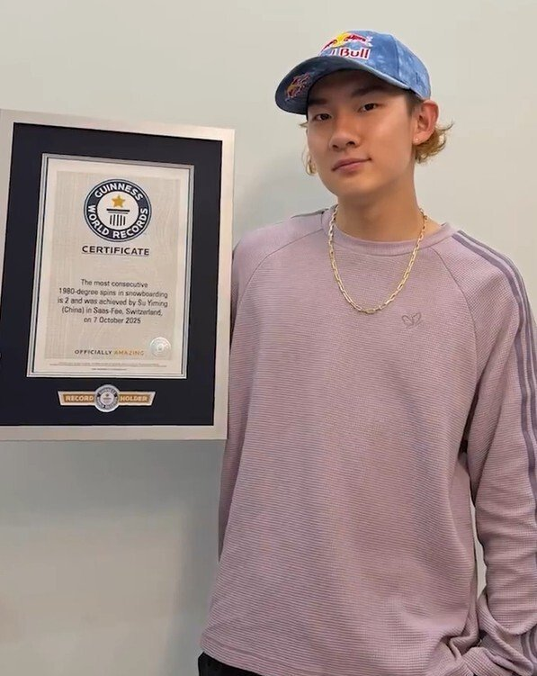 今年10月初,中国单板滑雪运动员、北京冬奥会金牌得主苏翊鸣发布视频,展示自己在训练中成功完成了世界上首个“背靠背”1980度空翻动作。该高难度动作即在单板坡障赛道的连续两个跳台上,相继做出方向相反的一个反脚内转1980度空翻、一个正脚内转1980度空翻。苏翊鸣是迄今为止首个将这两个高难度动作连接起来的运动员。12月25日,据吉尼斯世界纪录网站显示,这一连续动作得到了认证,苏翊鸣成功创造了“一次连贯滑行内完成单板滑雪1980度转体次数最多”的吉尼斯世界纪录,苏翊鸣也收获了纪录证书。