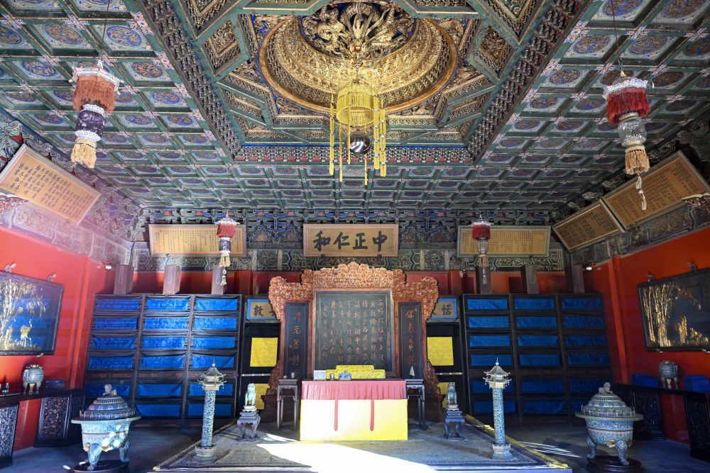 原状陈列遵循历史原貌。养心殿室内正殿宝座上方悬挂雍正御笔“中正仁和”匾,西暖阁“勤政亲贤”匾额下的楹联恢复如初,三希堂内则按记载还原了乾隆时期的陈列场景。