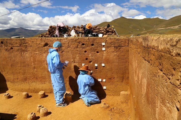 走进皮洛遗址考古发掘大棚,约两米厚的文化层如一部立体“地书”。仔细观察会发现,探方剖面的地层黄红交错,黄色部分是冷期的印记,红色部分则是暖期的留存,每个地层都是约万年时光的切片,揭示出青藏高原东南部古环境的变迁。