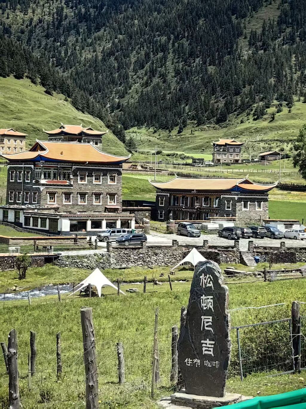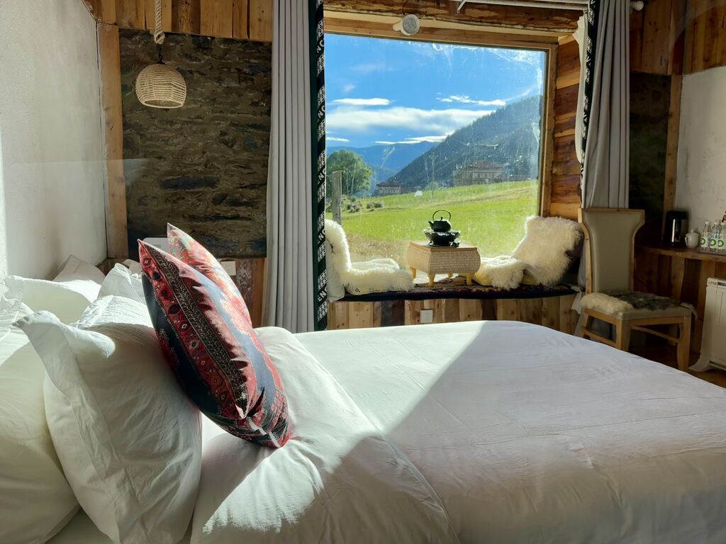 那一年起,贡嘎泽仁开始建设民宿,资金有限,他就自己动手,学木工、砌石墙,保留木雅建筑特色。曾经的草库、柴棚化身为休闲喝茶区,老屋改造翻新成为温馨住房。不到5年时间,具有木雅建筑风格的民宿在大山深处悄然成形:松顿尼吉,这个以海拔高度命名的民宿,成了日泽村的第一家民宿。