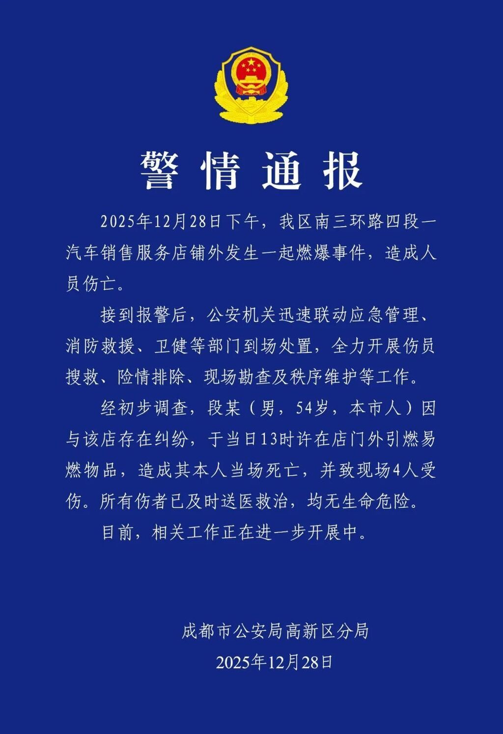 2025年12月28日13时许,该区南三环路四段一汽车销售服务店发生一起燃爆事件。经进一步调查,现针对社会关注问题续报如下。