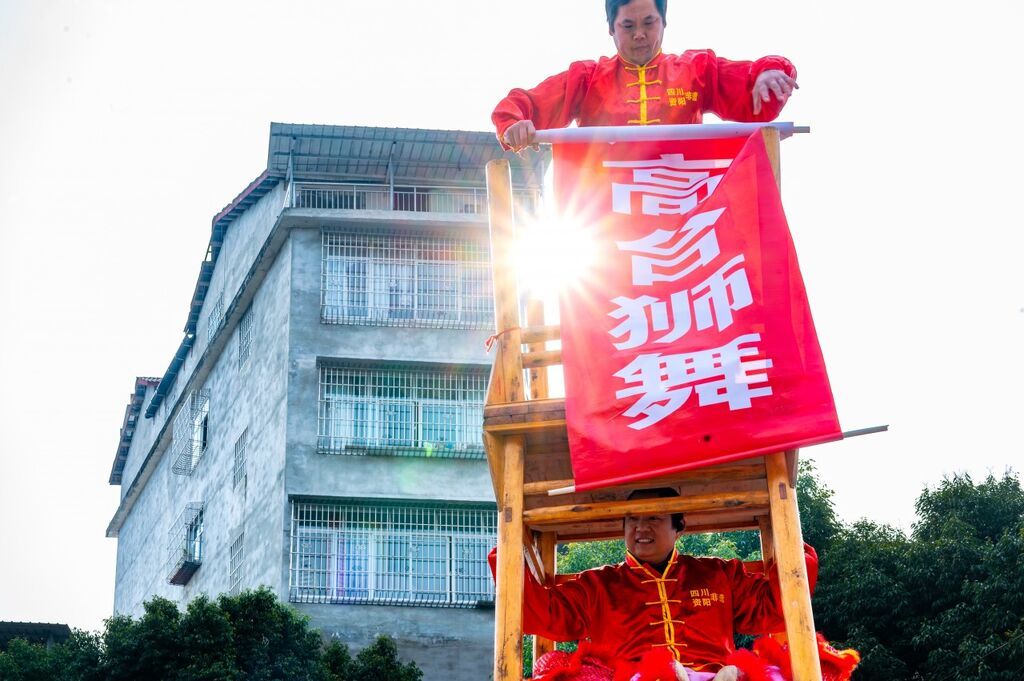 “桌腿一蹬,鼓点一响,狮子就‘活’了!”随着锣鼓声破开晨雾,在资阳市雁江区堪嘉镇文化广场,12张八仙桌已叠成一座巍然“塔台”。顶端最后一张方桌四脚朝天,面积仅0.6平方米。非遗代表性传承人傅强(狮头)与其67岁的师父李绍华(狮尾)互为依托,赤足稳稳踩在光滑的桌腿之上。一个高难度的“海底捞月”,引得围观群众阵阵惊呼。