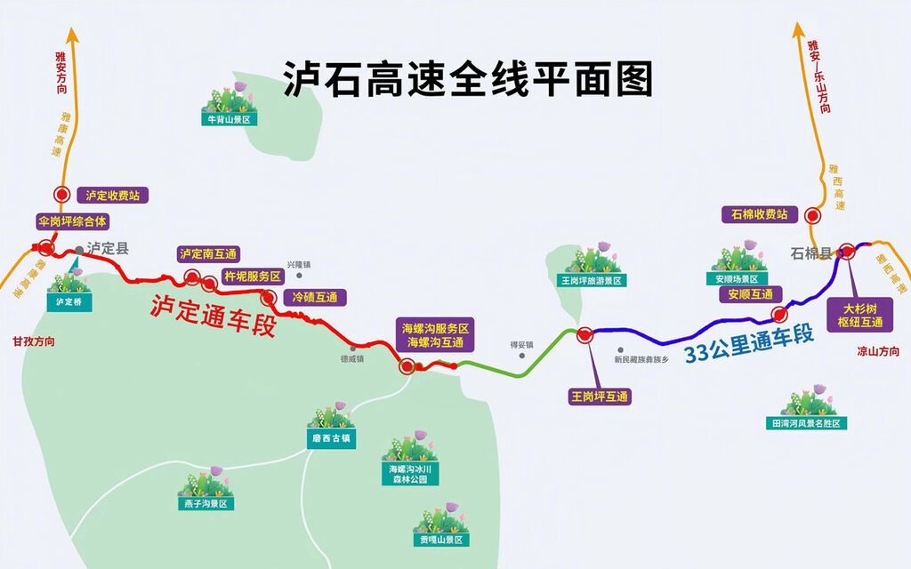 本次通车的泸石高速泸定段,起于泸定县伞岗坪互通,连接雅康高速,途经泸定南、冷碛,止于海螺沟互通,按双向四车道标准建设,设计时速80公里。路段内共设桥梁34座、隧道8座、互通式立交4处,目前该路段免费通行,泸定南、冷碛、海螺沟3处收费站已同步开通,配套服务区(停车区)将后续投用。
