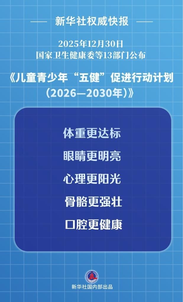 2025年12月30日,国家卫生健康委等13部门公布《儿童青少年“五健”促进行动计划(2026—2030年)》。