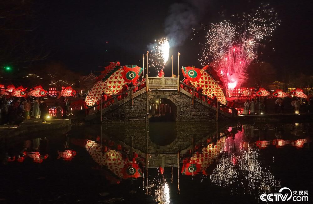 12月29日,鱼灯表演队伍在安徽省黄山市徽州区呈坎古村巡游。