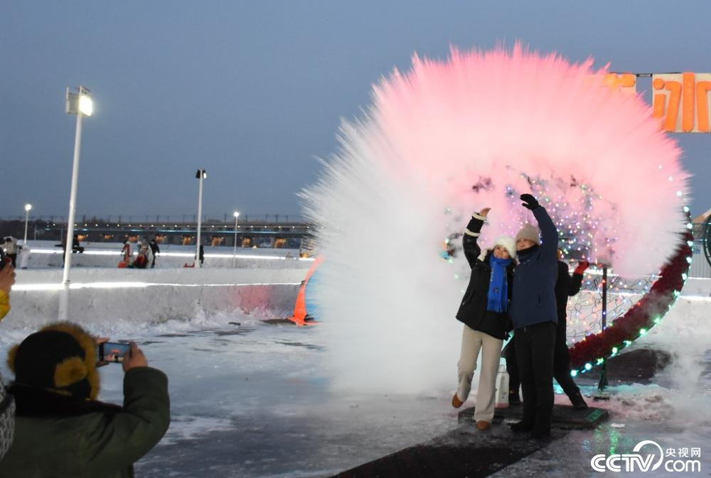 哈尔滨气温降至零下20多摄氏度,游客在松花江面上体验“泼水成冰”。