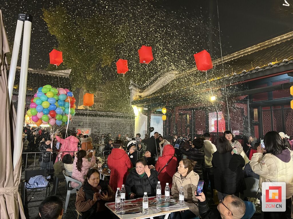 活动在绚丽灯光与节日装扮中拉开帷幕。钟鼓楼下,灯笼、气球与氛围灯交织出浓厚年味;拍照打卡墙、祈愿牌悬挂区与露营风品茗区依次排列,本地特色美食香气弥漫,为市民营造出温馨而愉悦的跨年氛围。