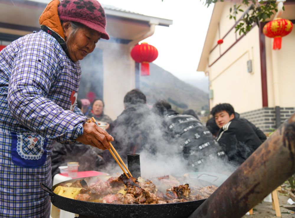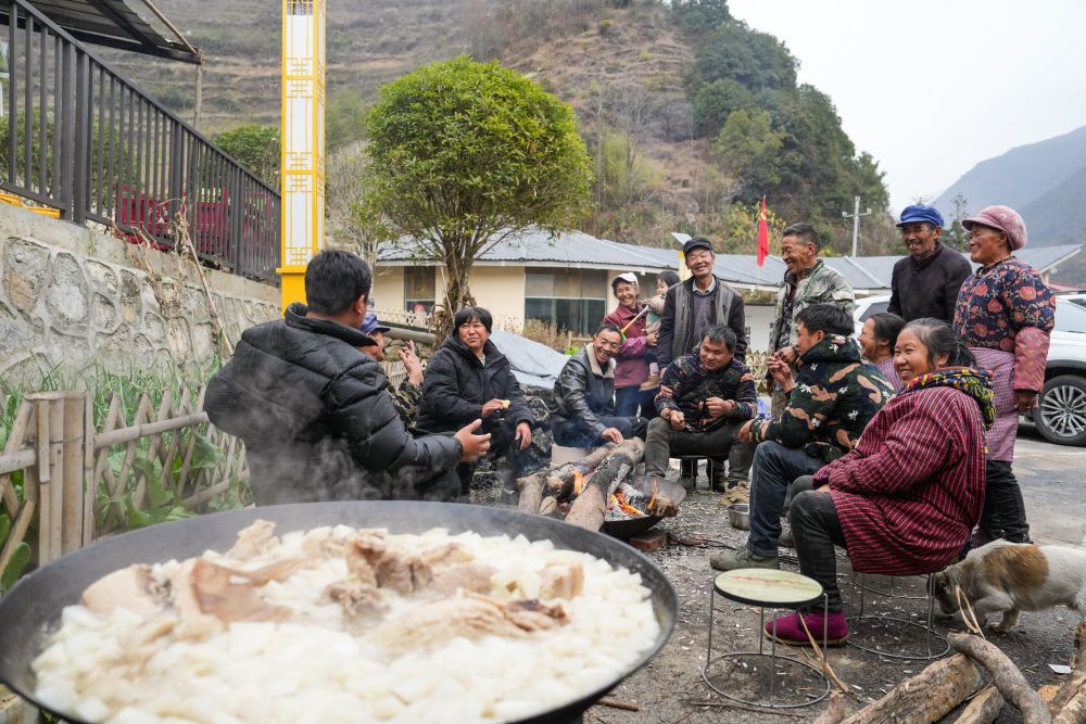 回访过程中,村民杨芬一家当天正在办乔迁宴。乔迁宴以当地特色美食“坨坨肉”为主,亲朋好友聚在一起,一边吃肉一边憧憬未来,分享乔迁的喜悦。见到我们到来,她直接拿了碗筷塞过来:“我们家今天买了一百多斤小猪肉,快来尝尝香不香。”