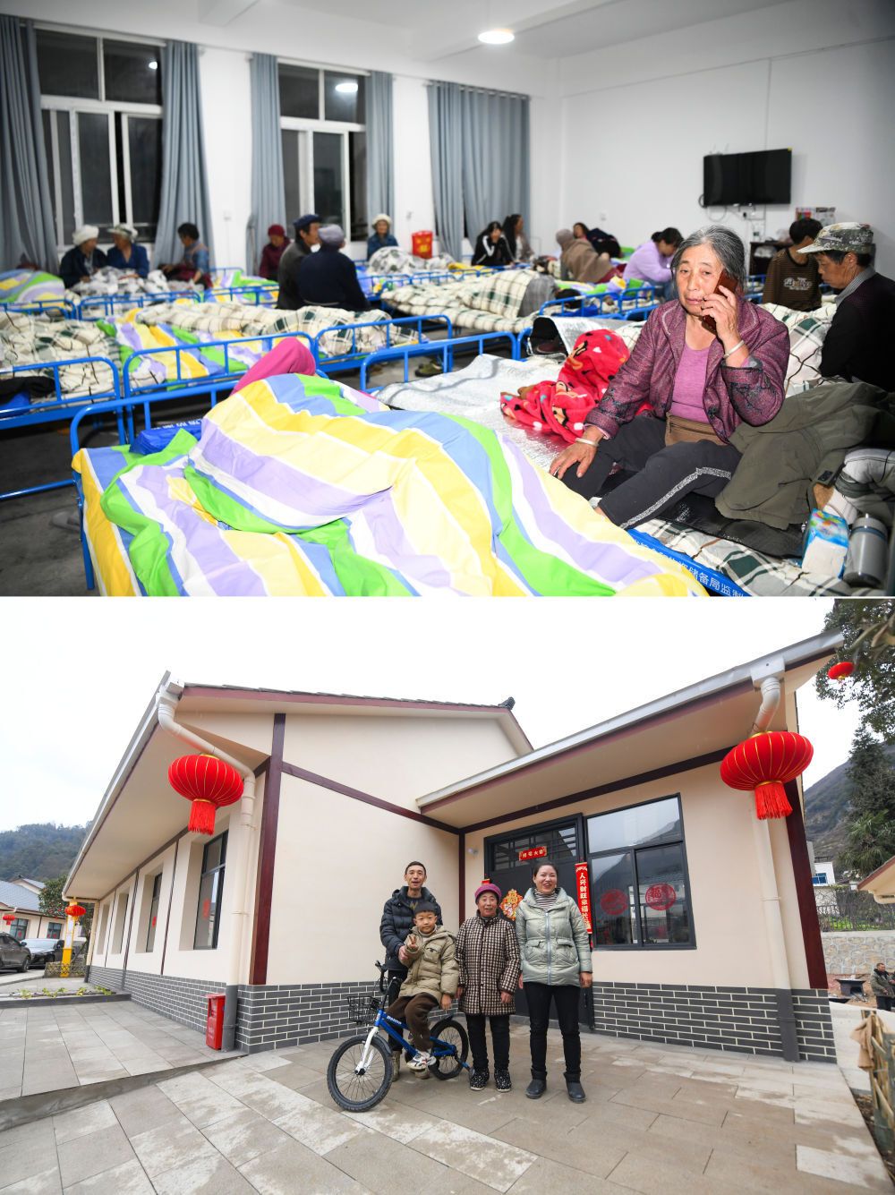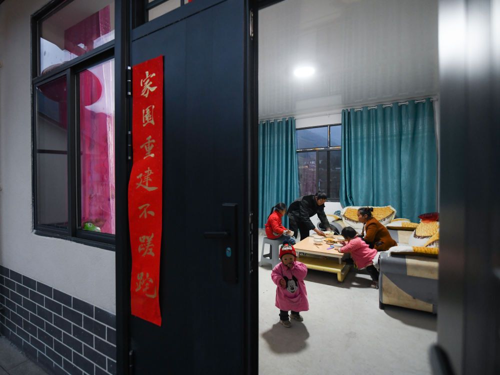 我跟随两姐妹到了她们的新家,新家刚贴上春联,各类生活所需也刚刚归置好,一家人在其乐融融地吃晚饭。和两姐妹家一样,灾后仅6个月,40户安置户村民陆续搬进宽敞明亮的新居。