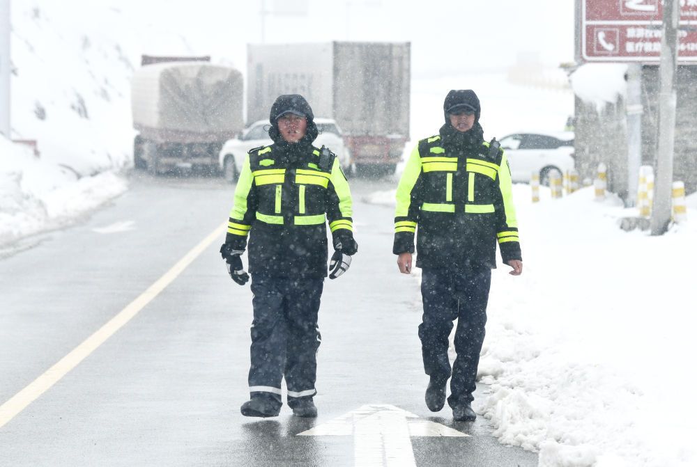 “‘二台子’那个弯道背阴,冰还没化,要把警车开到路上去提醒。‘老2885’弯急,要多注意。‘小坝子’要守两个人,提醒车子一定不能占道停在路上!”四郎多吉在对讲机里“排兵布阵”。