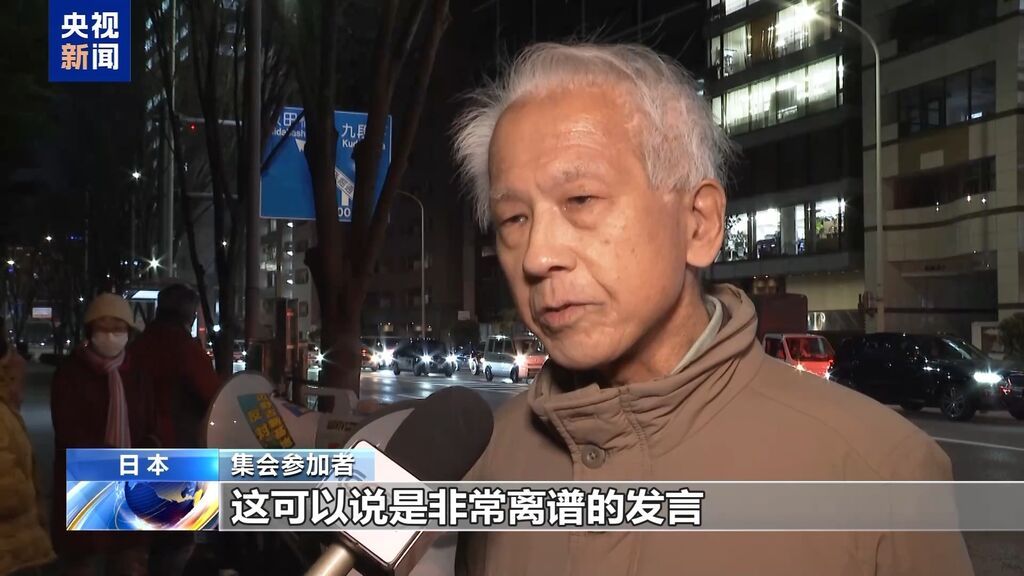集会参加者:这可以说是非常离谱的发言。高市发言完全否定了迄今为止日本的防卫政策,这是一种极其危险的动向。