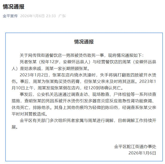 ·广东汕头深夜通报“12岁男孩餐饮店内被烫致死”事件。