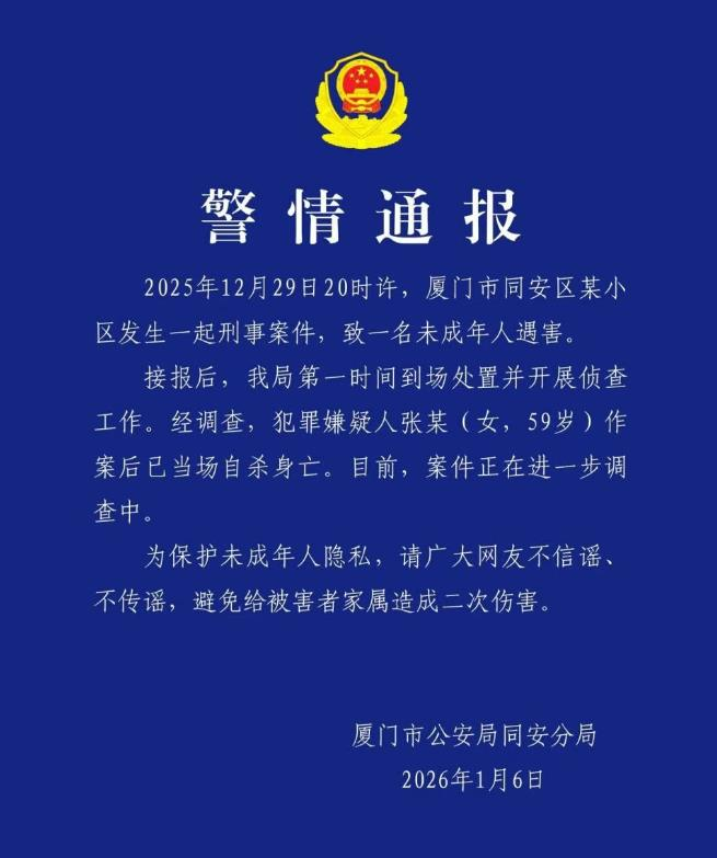 ·5岁男童小区内遇害,警方通报:犯罪嫌疑人张某(女,59岁)作案后已当场自杀身亡。