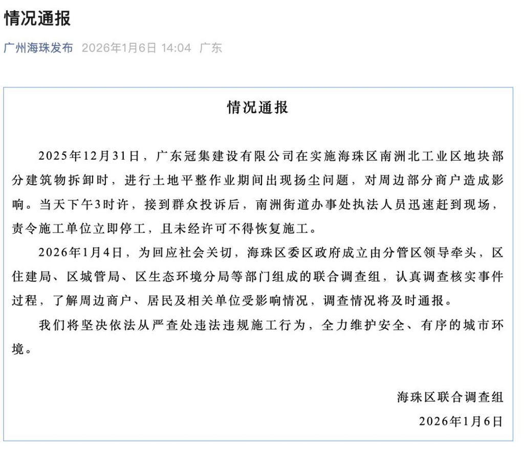 ·广州一工地被指扬尘逼迁,海珠区通报:责令涉事拆卸公司停工整改,立案处罚。