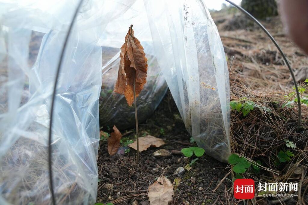 尹胜掀开了一个薄膜“小帐篷”,里面是一棵栎树苗。这是一棵菌根苗,已经感染了松露菌丝,被移栽到华山松林中,静静成长。