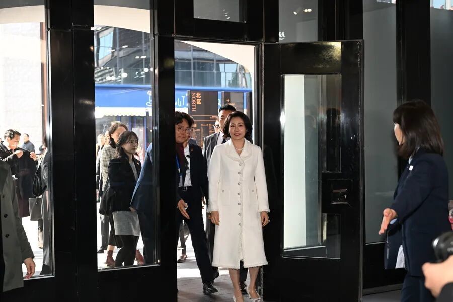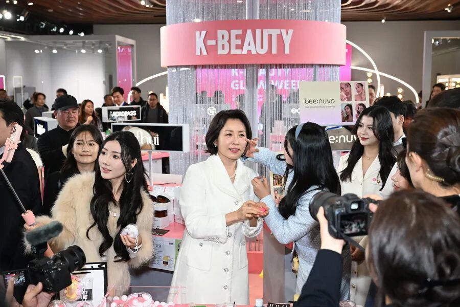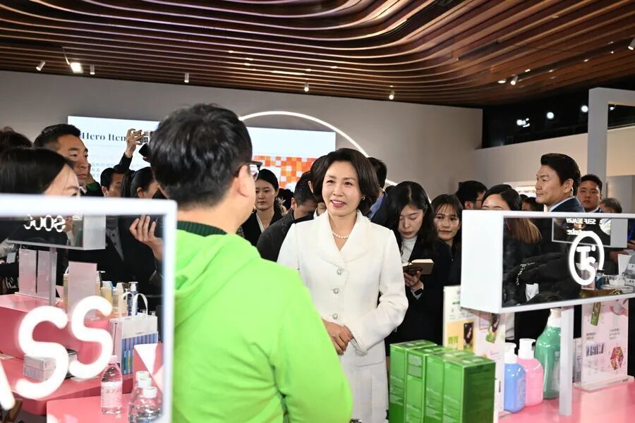 今天上午,韩国总统夫人金惠景来到上海BFC复星艺术中心,参观“K-BEAUTY GLOW WEEK”活动,感受韩国美妆品牌产品。
