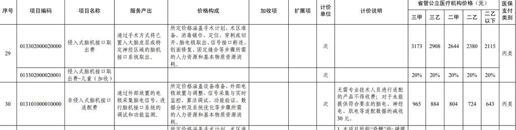 根据国家医保局相关医疗服务价格项目立项指南要求,近日,四川省医保局印发相关通知,整合了神经系统医疗服务价格项目82项,并明确医保支付类别。82项神经系统医疗服务价格项目中,包含了四川省脑机接口医疗服务项目及价格。此政府指导价为最高限价,今年4月30日起执行。