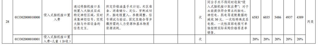 “侵入式脑机接口置入费”项目指通过将脑机接口系统置入大脑皮层或特定神经区域,实时采集神经信号,实现大脑与外部设备的信息交互。省管公立医疗机构价格分别为:三甲6583元/次,三乙6035元/次,二甲5486元/次,二乙4937元/次,二乙以下4389元/次。所定价格涵盖手术计划、术区准备、消毒铺巾、定位、穿刺或切开、脑电极置入、参数调整、信号调试与验证、固定及缝合等步骤所需的人力资源和基本物质资源消耗。