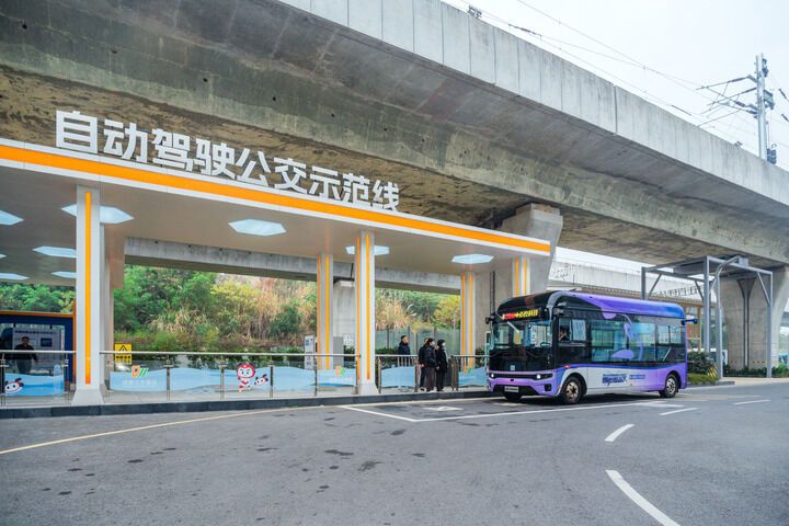 清晨,四川省成都市未来科技城的福田TOD地铁站旁,一辆深紫色的自动驾驶公交车缓缓靠岸,随后车门自动弹开,等待乘客上车。