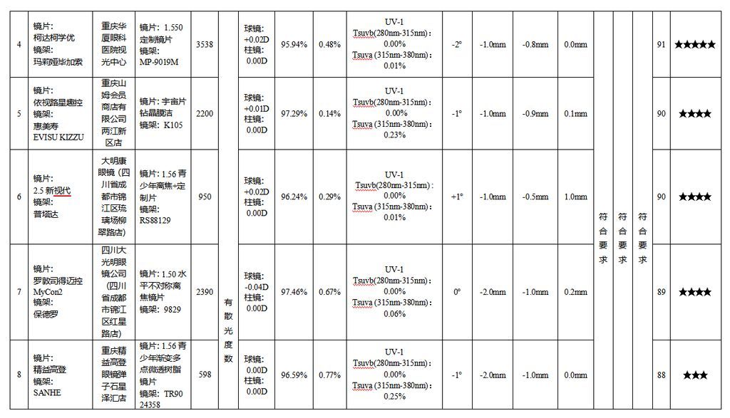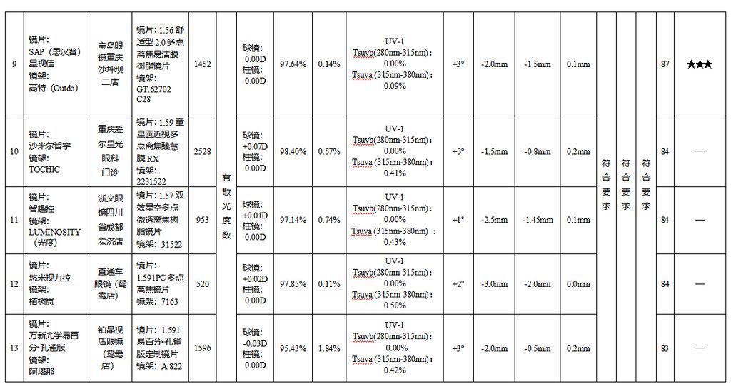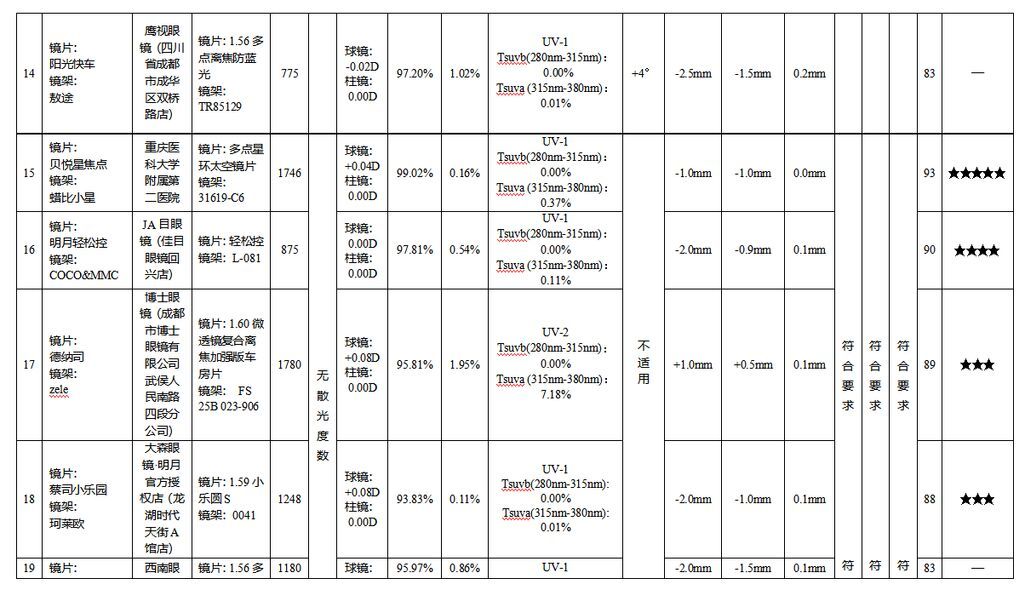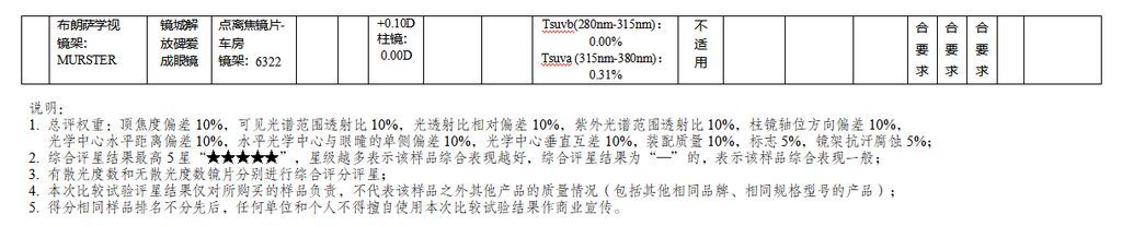 结果显示,14款具有散光度数的防控眼镜样品中,4款样品综合表现卓越获评五星;3款样品综合表现优秀获评四星;2款样品综合表现良好获评三星;5款样品综合表现一般,未获评星。其余5款无散光度数的防控眼镜样品中,1款样品综合表现卓越获评五星;1款样品综合表现优秀获评四星;2款样品综合表现良好获评三星,1款样品综合表现一般,未获评星。