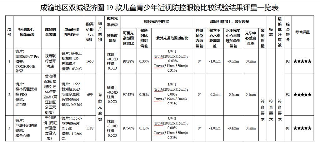 成渝地区双城经济圈市场儿童青少年近视防控眼镜品质状况如何?近期,四川省保护消费者权益委员会联合重庆市消费者权益保护委员会,对19款儿童青少年近视防控眼镜开展了比较试验,并于1月8日联合发布《19款儿童青少年近视防控眼镜比较试验分析报告》。报告显示,样品的综合表现与价格未必有直接关系。