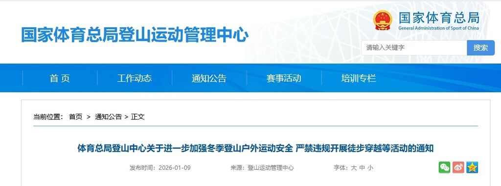 1月9日,国家体育总局登山运动管理中心发布关于进一步加强冬季登山户外运动安全、严禁违规开展徒步穿越等活动的通知。内容如下: