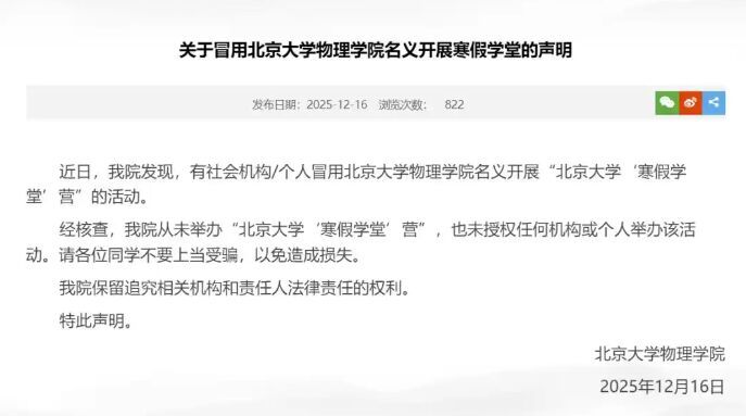 2025年12月16日,北京大学物理学院发表声明称,有社会机构、个人冒用北京大学物理学院名义开展“北京大学‘寒假学堂’营”的活动。北京大学物理学院从未举办“北京大学‘寒假学堂’营”,也未授权任何机构或个人举办该活动。