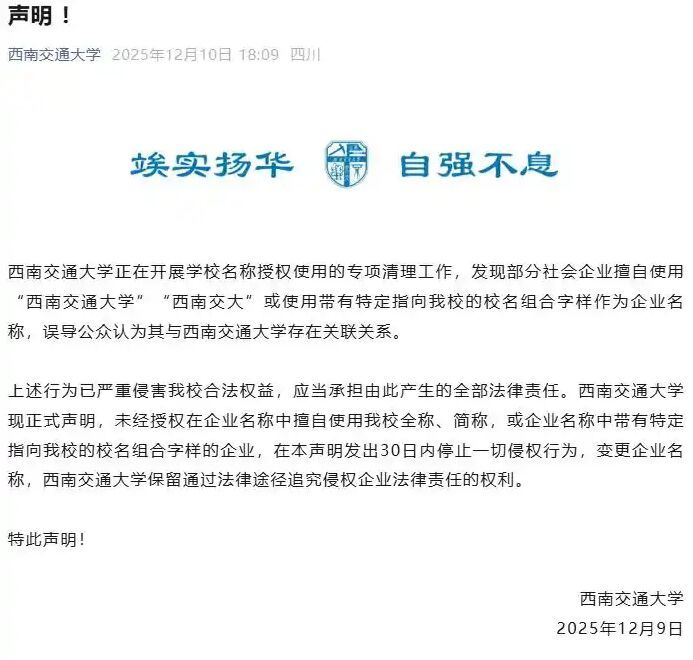 2025年12月10日,西南交通大学发表声明称,该校正在开展学校名称授权使用的专项清理工作,发现部分社会企业擅自使用“西南交通大学”“西南交大”或使用带有特定指向该校的校名组合字样作为企业名称,误导公众认为其与西南交通大学存在关联关系。