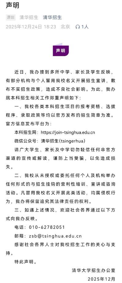 2025年12月24日,清华大学招生办发表声明称,接到多所中学、家长及学生反映,有部分机构与个人冒用该校名义开展招生宣讲,散布不实招生政策,造成不良社会影响。清华大学从未授权或委托任何个人及机构举办任何形式的与招生挂钩的营利性培训、宣讲或咨询活动。