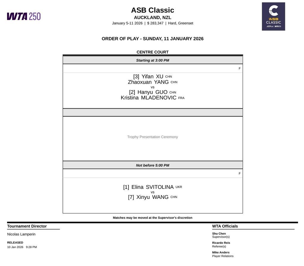 WTA250奥克兰站今日将进行女单决赛,王欣瑜对战斯维托丽娜,冲击个人单打首冠,比赛时间不早于北京时间12时。