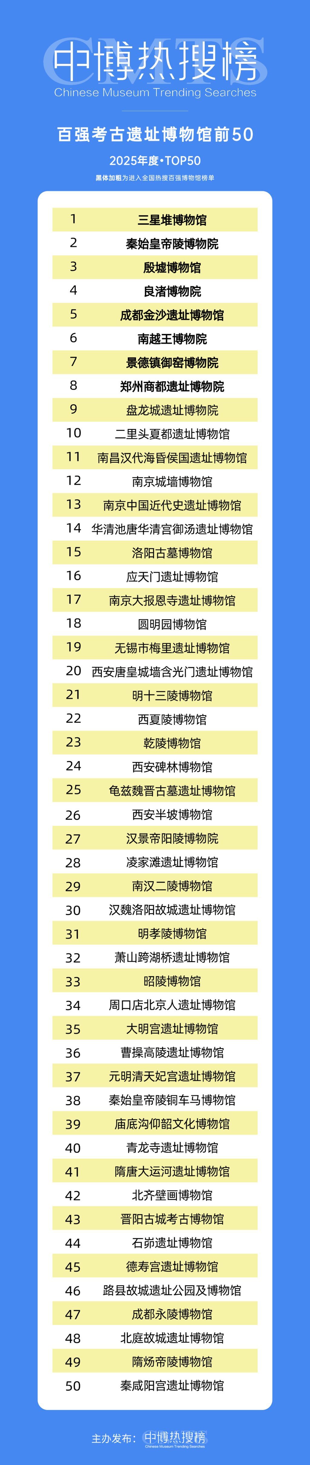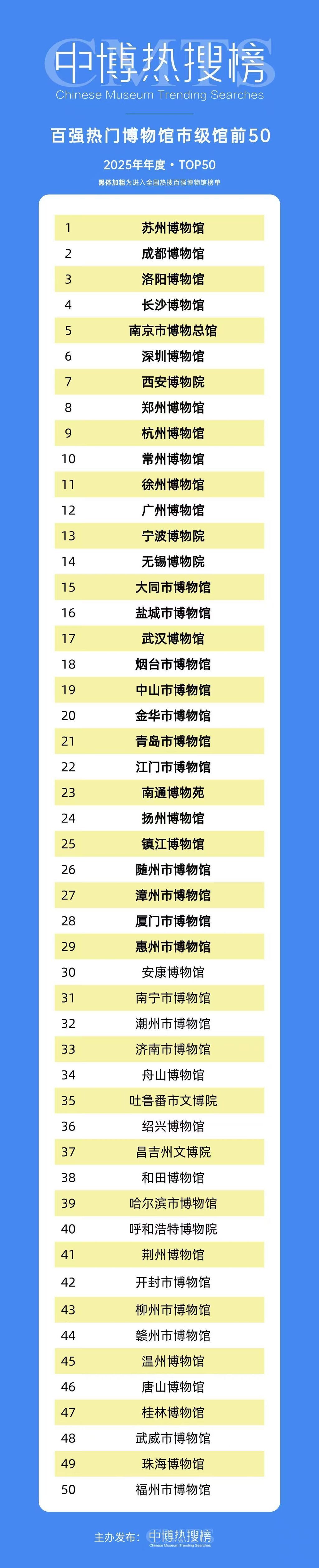 文博热、非遗热……公众对中华优秀传统文化的热情不减,四川的博物馆究竟有多受欢迎?近日,中博热搜榜发布全国热门博物馆百强等多个榜单,四川的三星堆博物馆和成都博物馆双双闯入年度热门博物馆前十,分别位列第八和第九。此外,在热搜榜2025年度百强考古遗址博物馆前50榜单中,三星堆博物馆和成都金沙遗址博物馆也分别位居第一和第五。