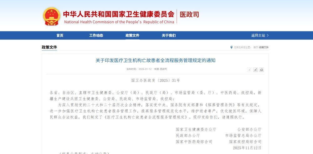 为深入贯彻党的二十大和二十届历次全会精神,落实党中央、国务院有关部署和《殡葬管理条例》等有关规定,进一步加强医疗卫生机构亡故患者服务管理工作,提高服务管理规范化水平,维护逝者尊严,优化就医环境,保障人民群众合法权益,我们制定了《医疗卫生机构亡故患者全流程服务管理规定》。现印发给你们,请遵照执行。