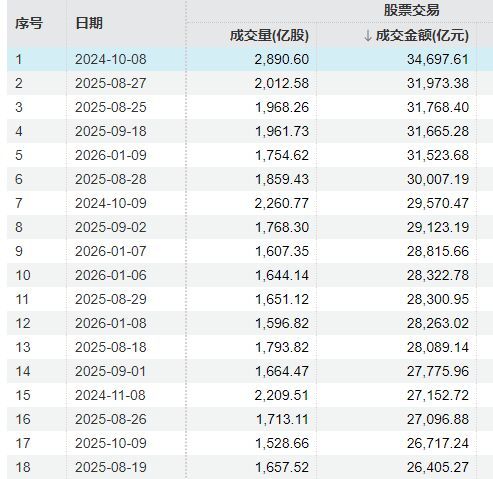 据Wind统计,A股成交额突破3万亿元此前总共发生了6次,分别是2024年10月8日,2025年8月25日、8月27日、8月28日和9月18日,2026年1月9日。
