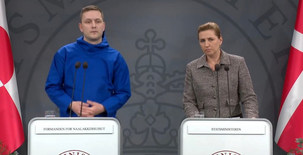 当地时间1月13日,丹麦首相弗雷泽里克森与格陵兰岛自治政府总理延斯-弗雷德里克·尼尔森举行联合记者会。