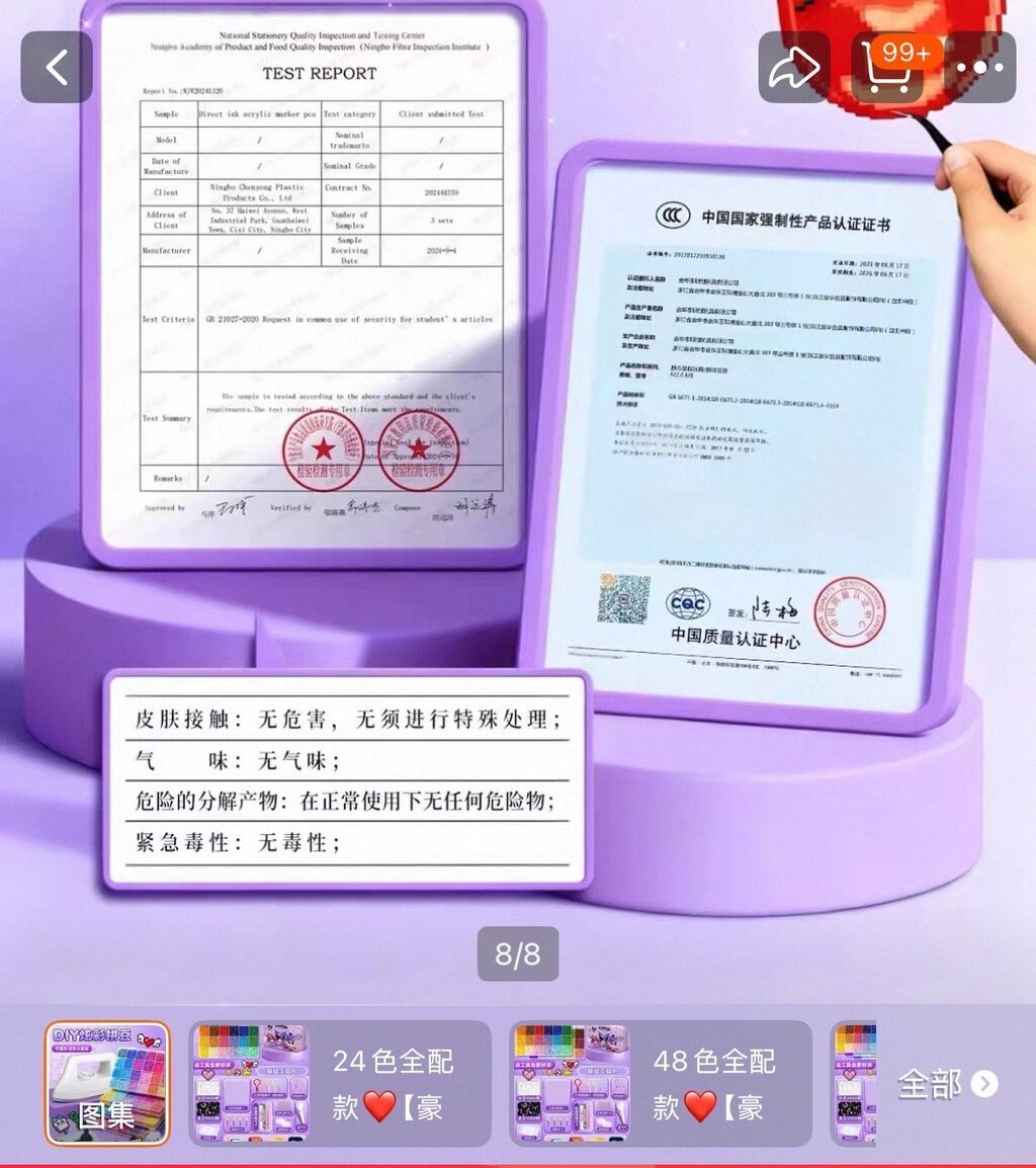 调查结果令人担忧。在十家店铺中,商家多称其售卖的拼豆使用的是耐高温的PE材料或EVA材料。在记者的要求下,有5家商家提供了所谓的“质检报告”,均来自同一家生产商“义乌市叮咚文具有限公司”。记者通过认证机构的网址查询,这份报告为真,但尝试联系该公司了解授权情况,截至发稿前未获回复。