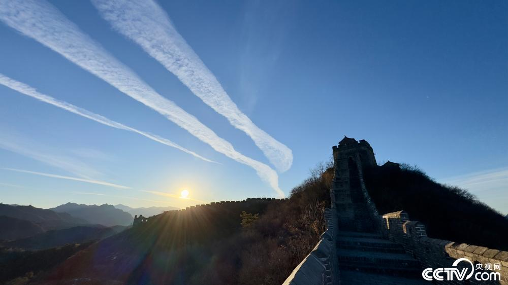 河北省承德市滦平县金山岭长城,金色朝霞与云霞相互映衬,美景如画。
