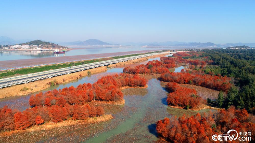 浙江省台州玉环市漩门湾国家湿地公园内的水杉,呈现出迷人的色彩,正是美不胜收。它们从翠绿渐变为橙红,如同簇簇燃烧的火焰,为寒冷的季节增添温暖。