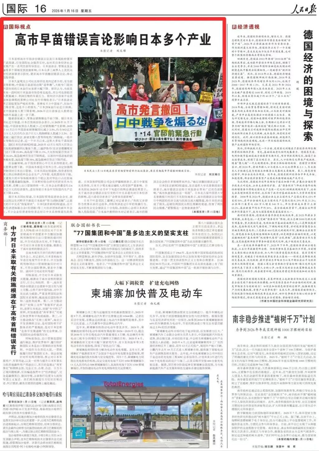 日本《东京新闻》报道说,东京造形大学名誉教授前田朗表示,高市错误言论给日本旅游业带来广泛的负面影响,“高市执意制造出这一局面”。日本名古屋外国语大学名誉教授川村范行不无担忧地表示,高市的错误言论导致日中两国的经济交流与民间交流大幅降温,给日本经济造成了损失,还堵住两国民众相互理解的渠道,伤害了两国民众情感,“要警惕这一态势愈演愈烈”。