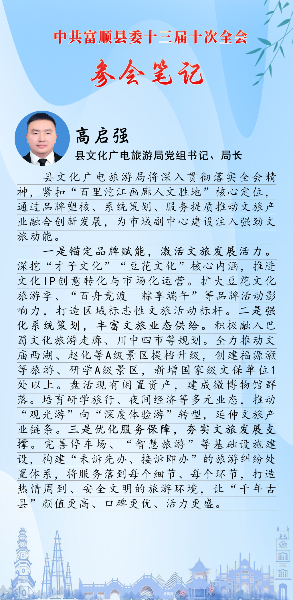 参会笔记⑧丨县文化广电旅游局党组书记、局长高启强:紧扣“百里沱江画廊人文胜地”核心定位,推动文旅产业融合创新发展