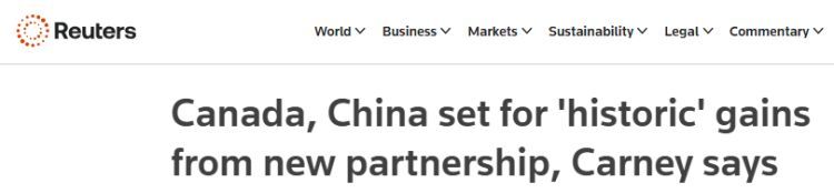 路透社的报道援引卡尼的表态指出,加拿大和中国正在推进构建加中新型战略伙伴关系,这将使双方通过优势互补实现“历史性”共赢。报道说,作为2017年以来首位访华的加拿大总理,卡尼此行旨在重建与加方第二大贸易伙伴的关系。