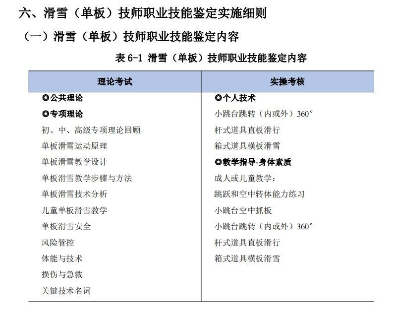 《滑雪(单板)指导员国家职业技能鉴定考核实施细则(2023版)》中技师职业技能鉴定内容