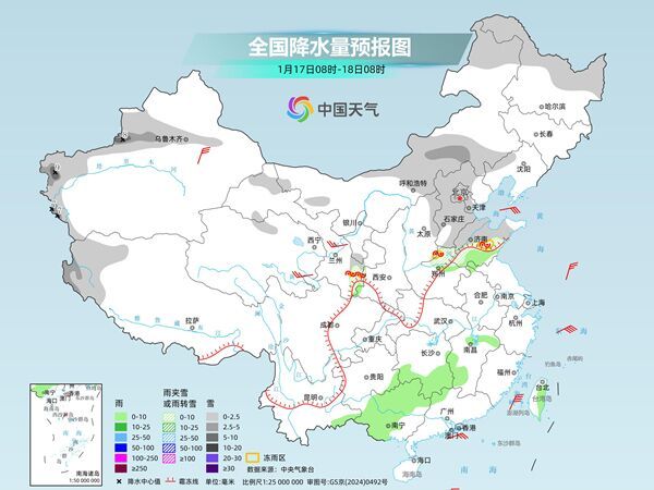 具体来看,中央气象台预计,今天,新疆沿天山地区和南疆西部山区、内蒙古中部、黑龙江北部、甘肃西部、河北、陕西东部、山东北部、河南北部等地部分地区有小到中雪或雨夹雪,其中,新疆伊犁河谷和南疆西部山区等地局地有大雪,山东中部、河南西北部、甘肃东南部和陕西南部等地局地有冻雨。山东南部、湖南南部、江西西部、广西中西部和北部、台湾岛东部等地部分地区有小雨。