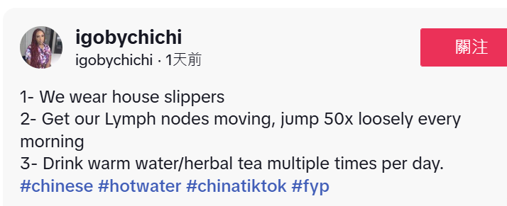 华裔博主雪莉的视频成了这场风潮的起点。她在视频中将冷幽默与文化洞察相结合,向粉丝介绍冬季养生、中医理念和华人饮食习惯:喝热水、在家穿拖鞋、农历2月17日是马年......