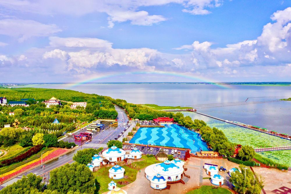 2023年9月19日拍摄的查干湖生态水岸。近年来,查干湖不断完善旅游基础设施,创新产品供给,构建起“渔猎体验+冰雪运动+特色消费”的完整产业链条,让冰雪渔猎这一古老文化IP持续“破圈”,实现从“一日节庆”到“一季活动”,从单一捕鱼到“观冬捕、赏民俗、玩冰雪、品美食”的生动转变,释放冰雪经济“热动能”。