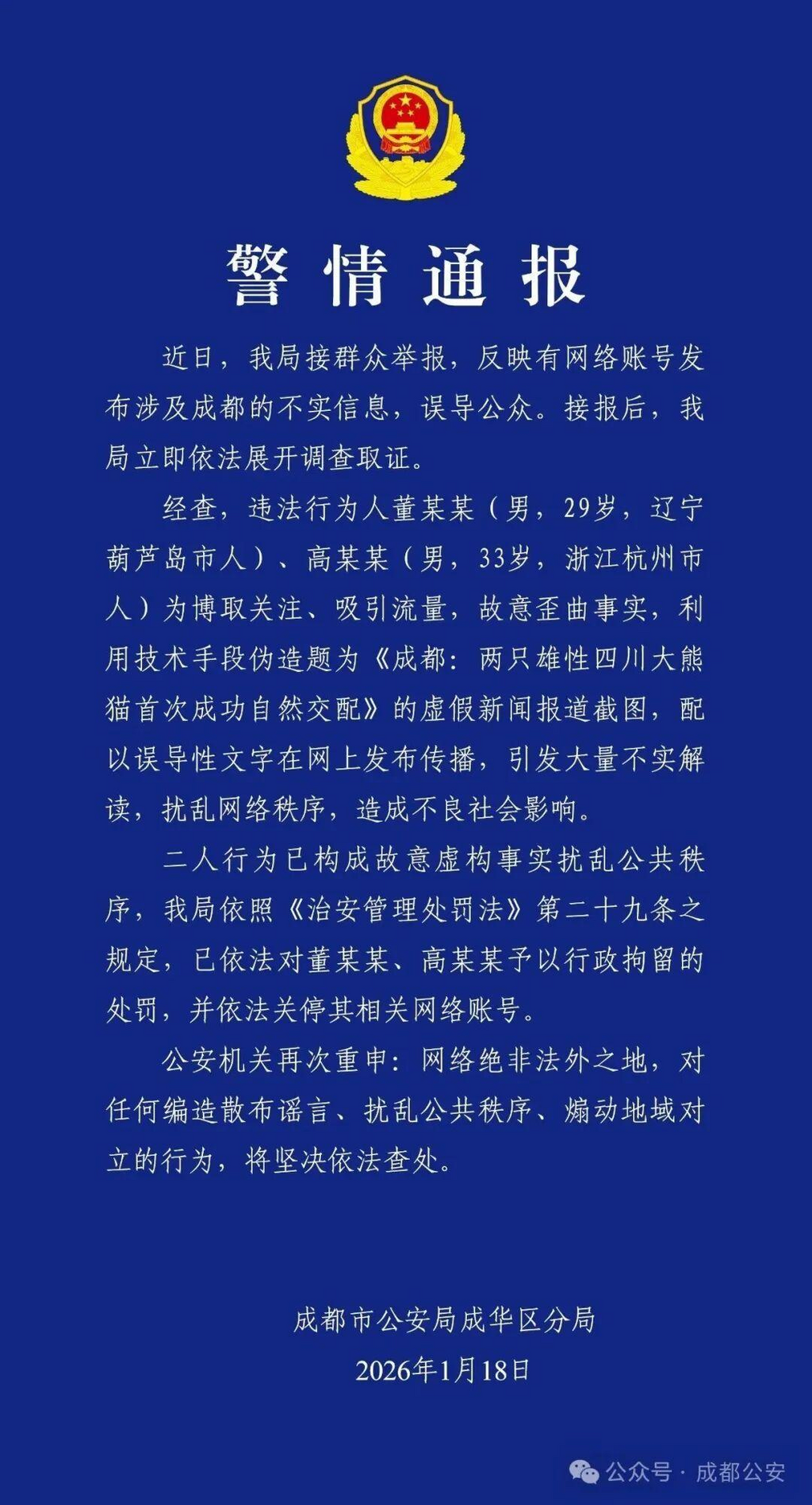 ·成都警方通报:二人炮制熊猫虚假新闻被行政拘留。