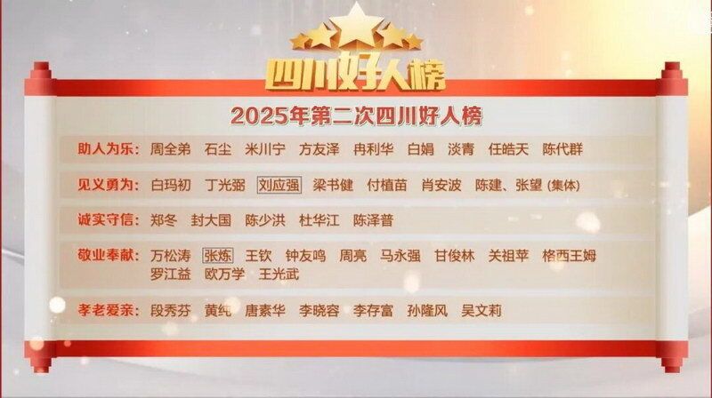 在这份名单中,每一位“好人”都用行动书写着责任与担当:长津湖战役老兵周全弟,英勇作战失去双臂,不改赤诚之心,以残躯为笔、忠诚为墨,辗转千场宣讲,让红色基因代代相传;阿坝“藏家女孩”白玛初,面对湍急河流中的溺水者,毫不犹豫纵身一跃,用青春勇气诠释了“义”的重量;乐山“粽子爷爷”陈少洪,30多年坚守街头小摊,一枚粽子始终保持“良心价”,用时光沉淀温暖,滋养了几代人的童年记忆;“长江鲟奶爸”周亮扎根长江上游30余载,以科研为刃、坚守为盾,在实验室与江河间奔波,为珍稀鱼类撑起生存屏障,筑牢生态保护的坚实防线;绵阳“好姐姐”唐素华,用半生岁月将灶台与病榻串联成守护之路,用不离不弃的陪伴,为残疾妹妹撑起一片晴空……