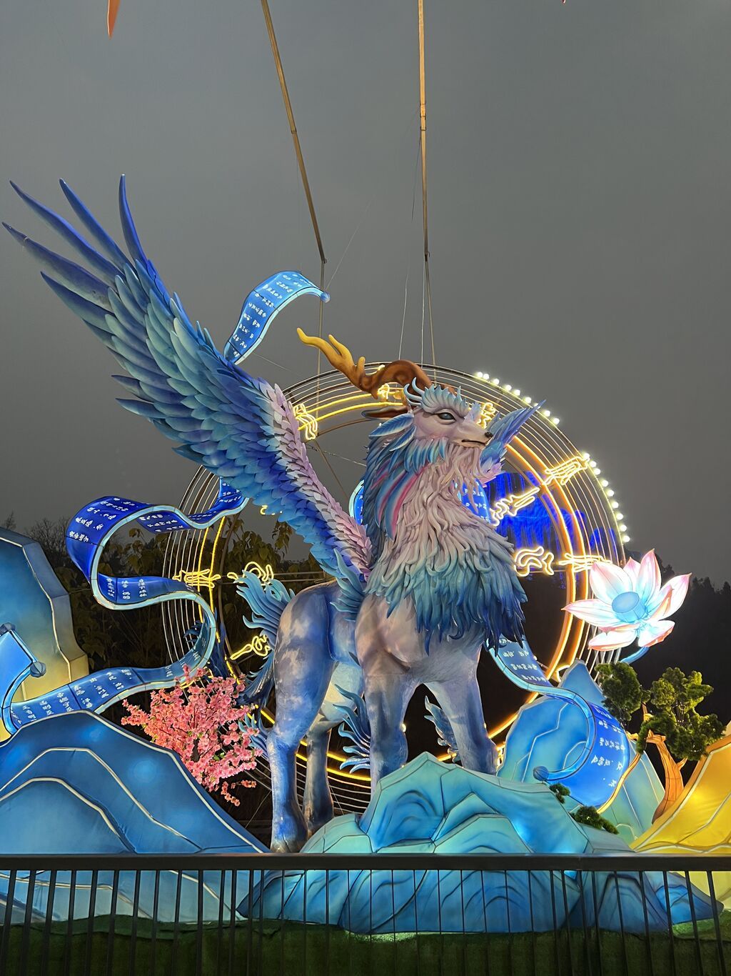 刘俊才介绍,青花瓷、药瓶并非首次出现在灯会,但这次他们对捆扎方法进行了测试、创新,使其表现力更强,神兽的形象更加栩栩如生,“由于青花瓷种类达到10余种,形状不规则,制作难度较大,需要非常有经验的彩灯工匠。”