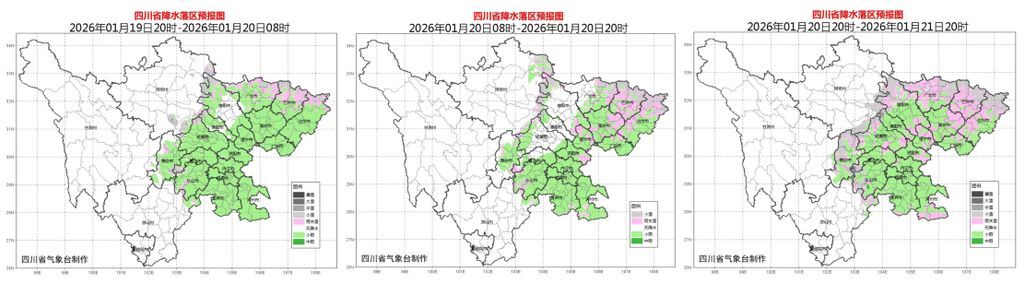 根据预报,19日至21日,我国中东部地区自北向南将先后出现大范围雨雪天气过程,1月19日8时至20日8时,四川盆地东北部部分地区有冻雨。